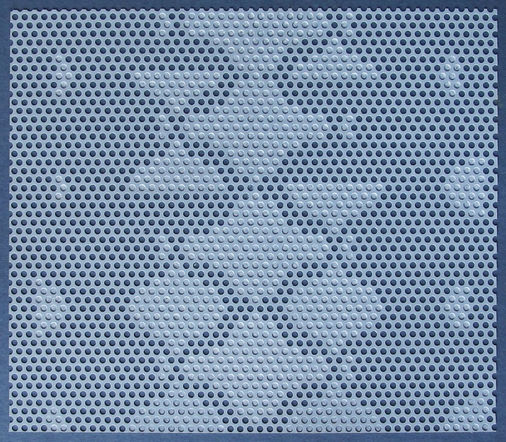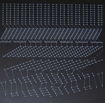 La "Serie WV" se gesta a partir de la idea de obtener la mayor cantidad de imágenes desde una misma matriz. La matriz es dicho vinilo autoadhesivo window vision, material con microperforaciones comúnmente usado en publicidad, lo cual me permite trabajar la línea desde la continuidad de puntos. La construcción de dichos dibujos se conforman, en primera instancia, rellenando las perforaciones del material, completa o parcialmente, con diversos lápices generando, a la vez, distintos matices. Al tener una misma matriz, se vuelve inherente auto-imponerme distintos problemas para abarcar el plano, lo cual se mantiene como regla a seguir dentro de los límites de la superficie escogida. Es decir, un ejercicio puede ser rellenar solo de cinco en cinco orificios en solo tres direcciones; o, lo mismo, pero en todas las direcciones posibles. De la misma manera, la decisión de si va a ser una composición simétrica o asimétrica. En algunos casos el material es retirado, quedando expuestos solo los puntos marcados, los cuales son posteriormente unidos con líneas, en donde también nuevas reglas son auto-impuestas.